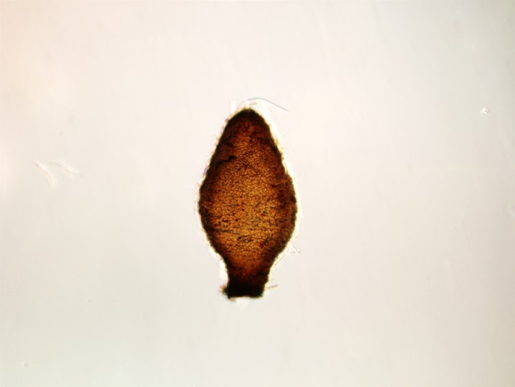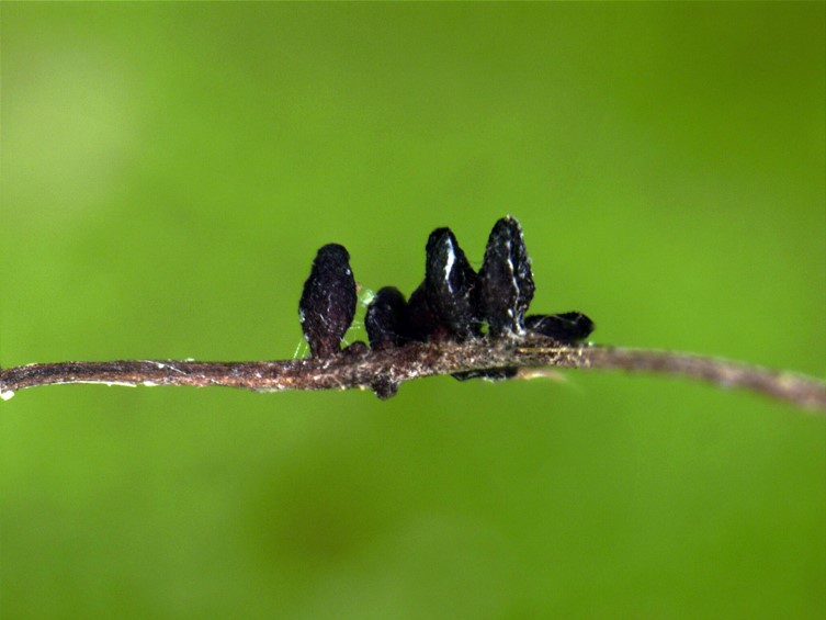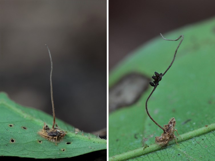 Stroma single, cylindrical and flexuous, arising from between the head and the thorax of host, brown-dark brown, 30-40 × 2 mm, unchanged in 3 % KOH.