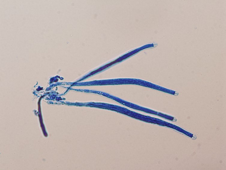 Asci cylindrical, 125–200 × 5–8 μm with asci caps, 3–5 × 5–7 μm.