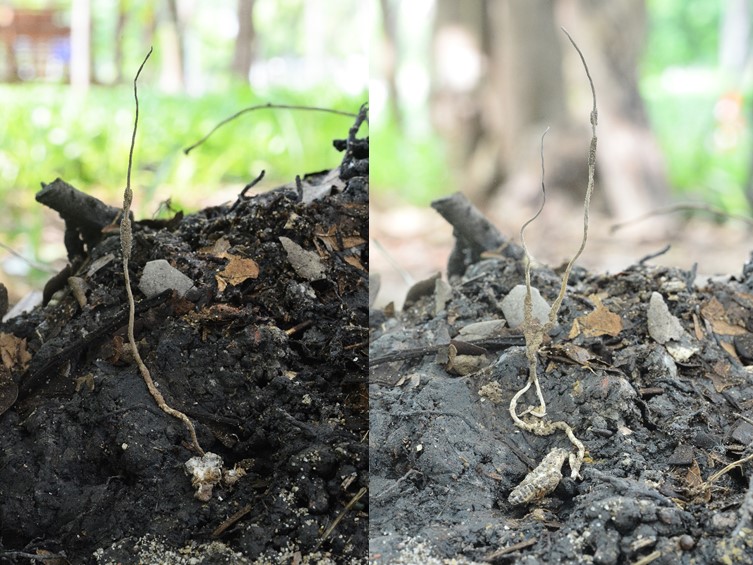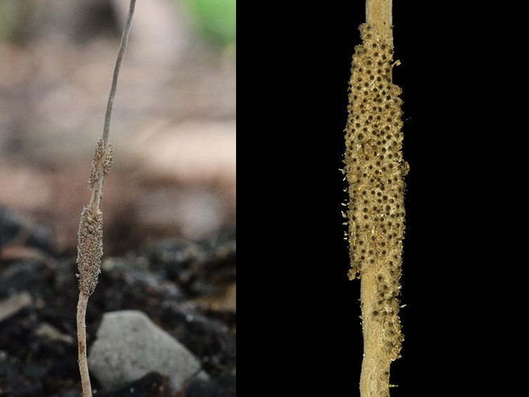 Stroma solitary, simple, cylindrical, up to 6 cm long, 1–2 mm wide, brown, ca. 4–10 cm deep buried under the soil. The fungal stroma emerging from the segment between the prothorax and mesothorax of one of the termite pairs. Fertile part distinctly subterminal with asexual morph at the apex, ca. 14–15 mm long, 4–5 mm wide. Asexual morph (Hymenostilbe-like) produced ca. 3 cm at the terminal part of the stroma, light brown to grey.