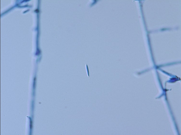 Conidia hyaline, smooth, fusiform, arising from the apex of the neck, one celled, 6–18 × 2–4 μm.