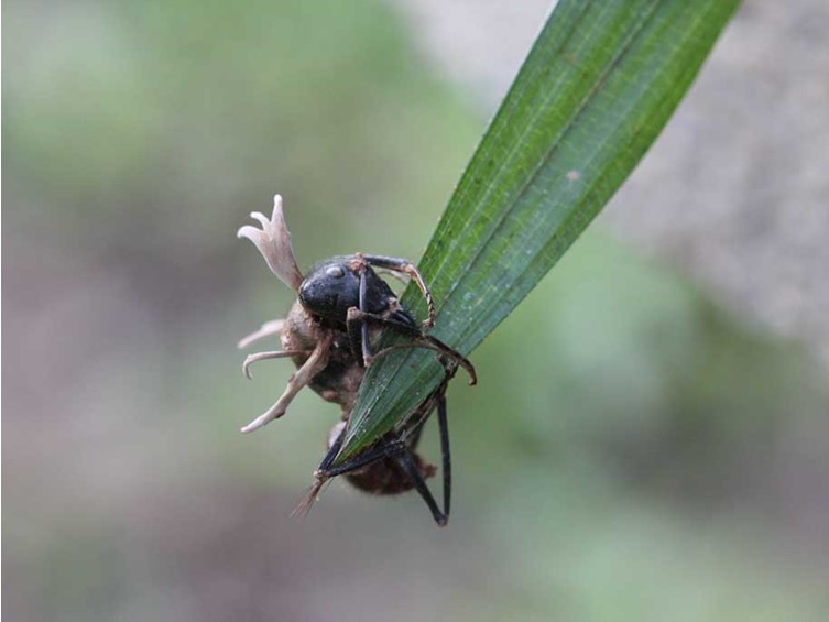 stromata are usually present. A single stroma arises from the back of the head, 8-9 mm long. The other two stromata emerge from the top joints of the left and right forelegs where these join the thorax, the right stroma is ca 6.5-17 mm long and the left stroma ca 7-18 mm long. They are sturdy blackish brown. The