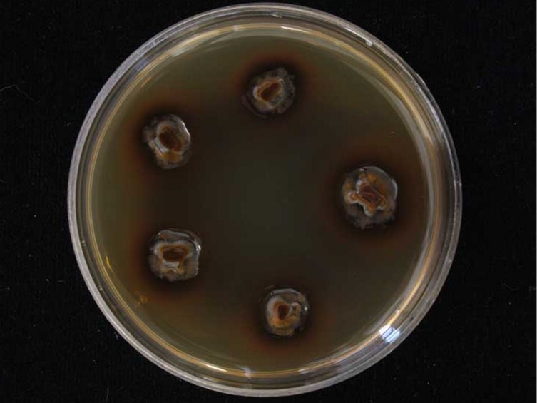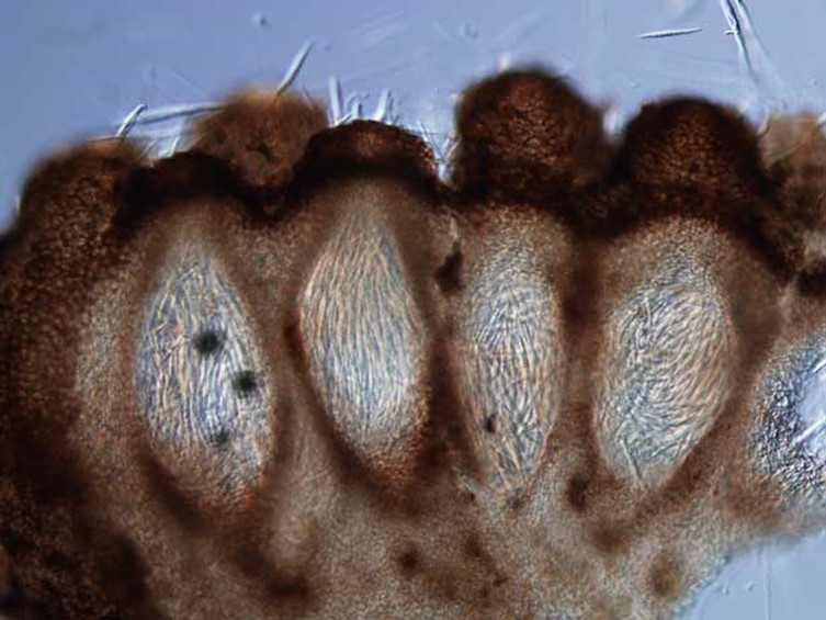 perithecia are closely packed and appear to be covered by a blackish-brown wall, 1.5-2 × 1.5-2 mm. They are produced in a pulvinate black stromatal cushion that may develop at various places along the stromata but preferably on the upper two-thirds of the stroma. Several perithecial cushionsmay develop. Below the perithecial plate near the base of the stroma are coarse golden brown hairs. Above the perithecial plate is a loose hymenium with occasional phialides visible. Perithecia fusoid-ellipsoid with rounded ostioles, 350-420 × 180-210 mm, with ostioles slightly protruding on the surface of the plate.