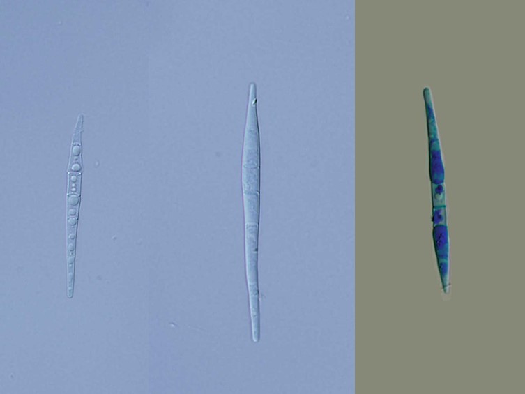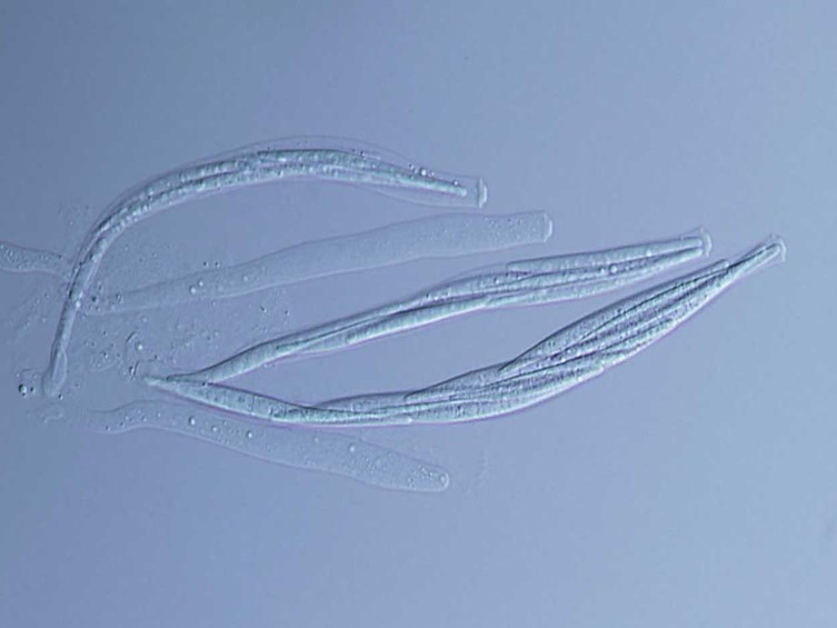 Ascospores cylindric with tapering ends, 60-75 × 3-5 mm, multi-septate, remaining whole after discharge.