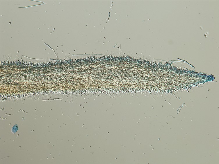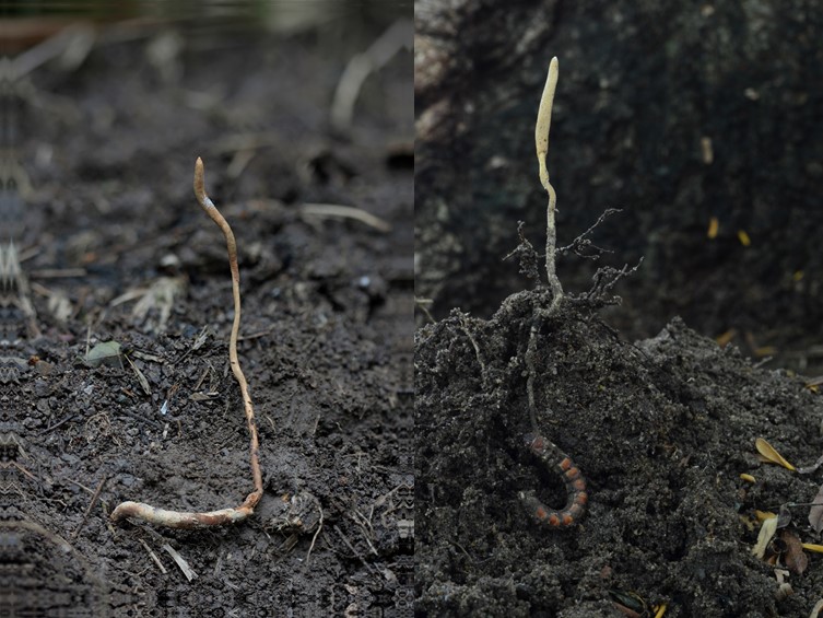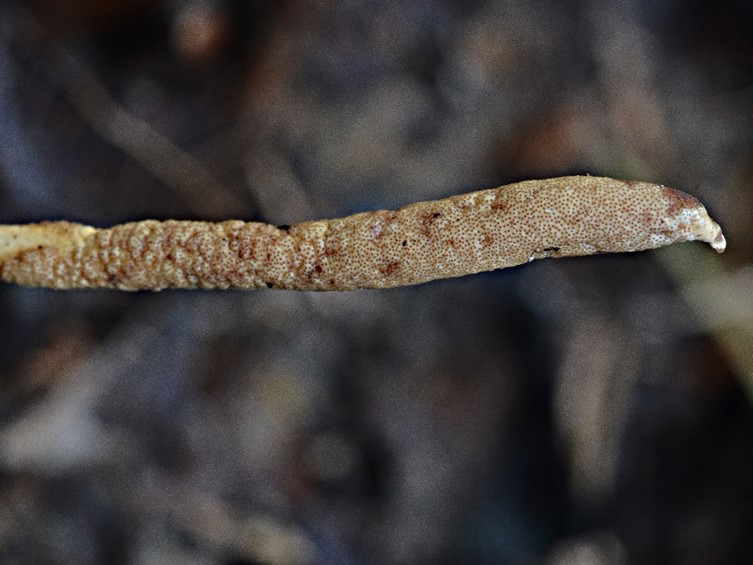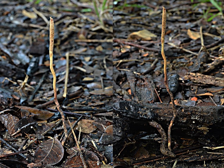 Stroma solitary, up to 11 cm long and 1.5-2.5 mm in width, cylindrical, cream, stipe simple. Rhizoids flexuous, arising from the head of Coleoptera larva, ca 2-6 cm long buried under the ground.