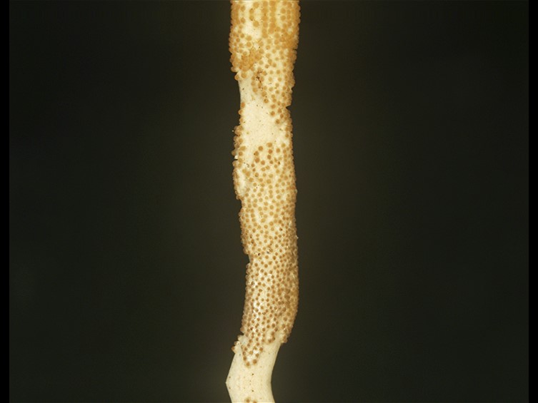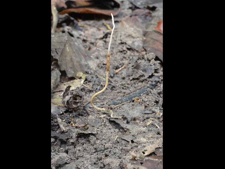 Stromata solitary, simple, cylindrical, up to 10 cm long, 1–2 mm wide, brown, ca. 4–10 cm deep buried in the soil. The fungal stroma emerging from the segment between the prothorax and mesothorax of one of the termite pairs. Fertile part distinctly subterminal with asexual morph at apex, ca. 10 mm long, 2 mm wide. Asexual morph (Hirsutella-like) produced at the terminal part of the stroma, light brown to grey, composed of hyaline, parallel strands of septate hyphae.