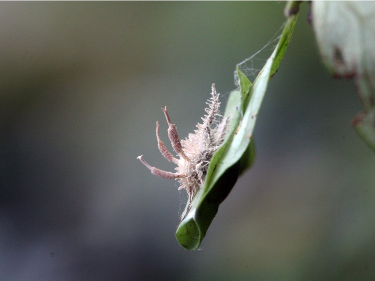 stroma and below the perithecial layer. Numerous synnemata arising from the body and legs of the host producing hymenostilbe-like asexual morph. The synnemata measured up to 1 cm long and ca 0.5 mm wide, powdery due to sporulation, pale cream. Conidiophores arising from hyphae of synnemata, forming a hymenial layer. Phialides, 6-15 × 3-5 µm, hymenostilbe-like, clavate, cylindrical basal parts, bearing mini cylindrical projections, ca 1 × 0.5 µm. Conidia hyaline, smoothwalled, narrow fusoid, 1-celled, 5-8 × 1-2 µm.