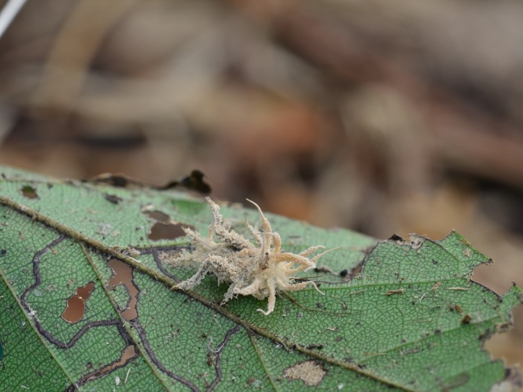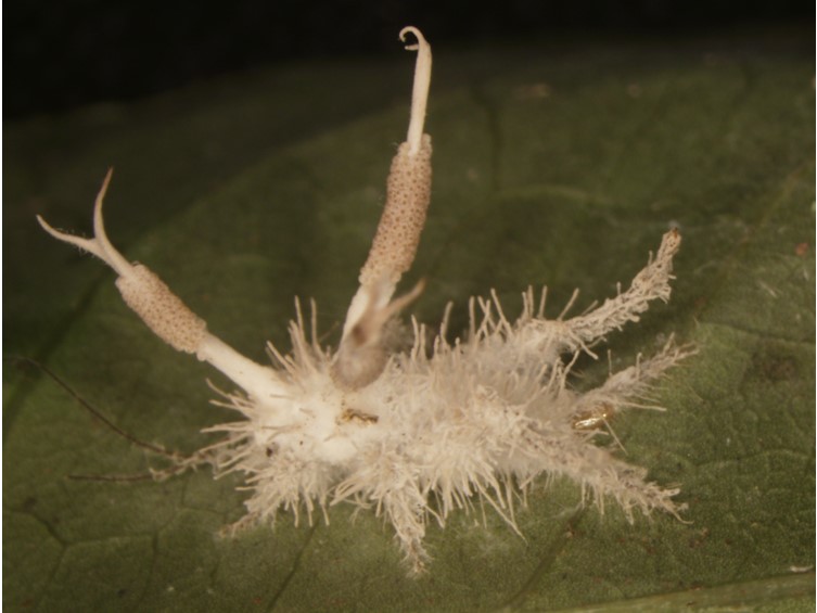 Stromata multiple, arising from the head region and body of the insect host, pale cream, cylindrical, up to 8 mm long. Densely packed