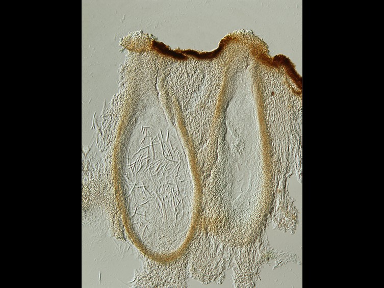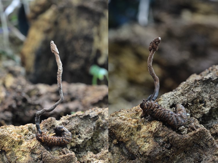 Stromata single or double on Coleoptera larvae, brown, dark brown to black, cylindrical, slightly curved to curved, emerging from the fallen off feet pairs of the larva, 5.5–10 cm long and 2–3 mm broad, enlarging abruptly at the