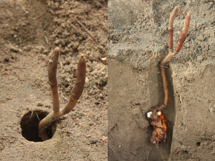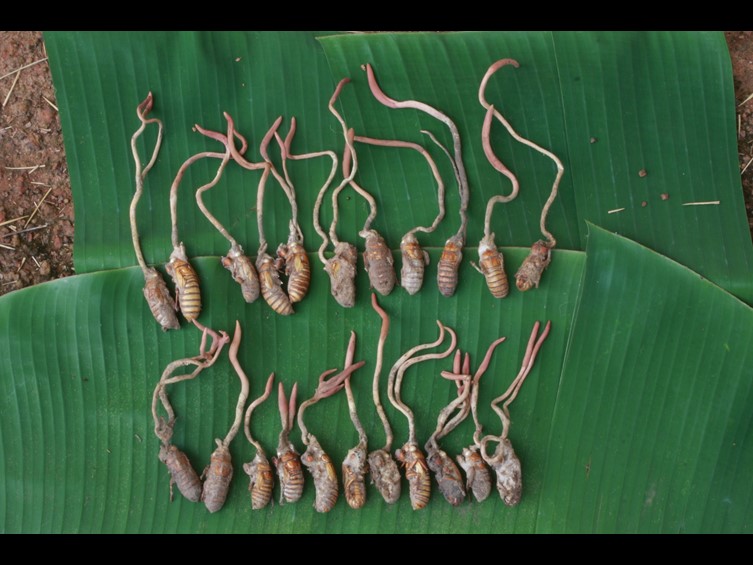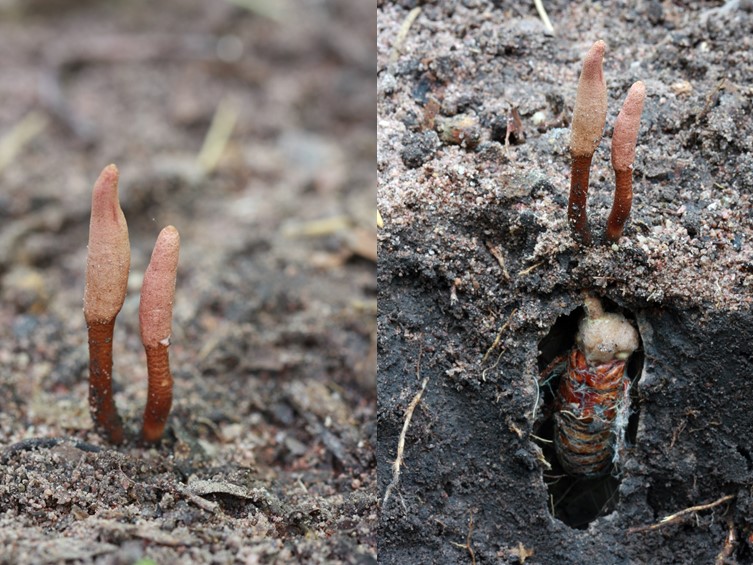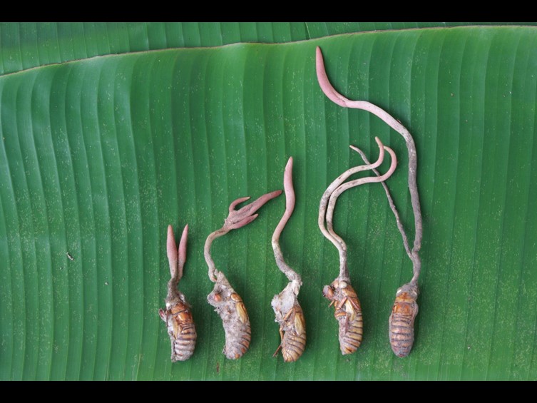 Stroma solitary arising from the dorsal region of the head or the thorax, up to 12 cm long, 2 mm wide. Fertile part, cylindrical to narrowly ovoid, terminal, orange to dark orange.