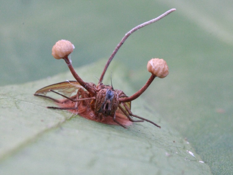 Stromata stipitate, usually two stromata arising from the thorax region of host, beneath the wings, capitate, unbranched. Stipes cylindrical, smooth, brownish-orange, 4–8 mm long, 0.5–1.5 mm wide with a fertile apex. Sexual morph: