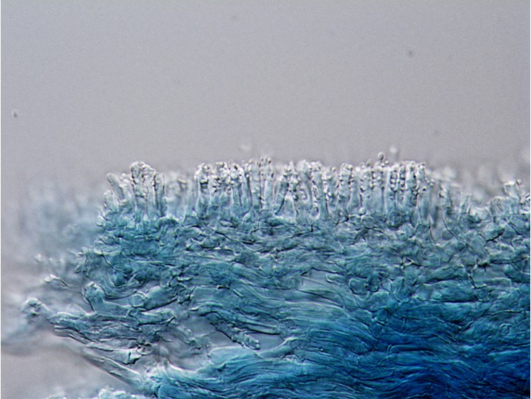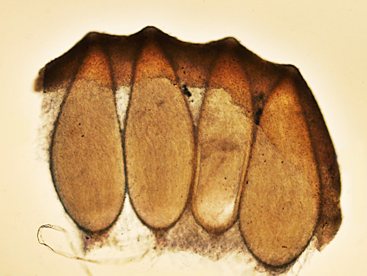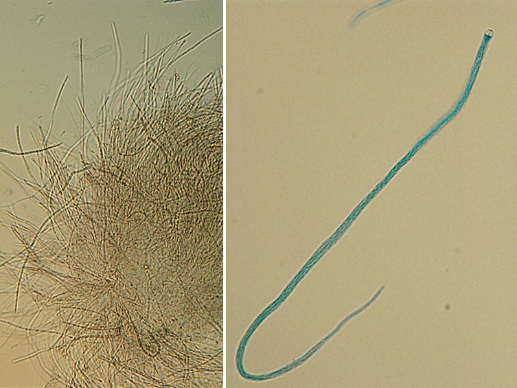 Asci cylindrical, up to 720 μm long, 4–5 μm wide, with cap 3–5 μm thick.