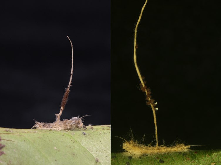 Stroma solitary, simple, wiry to pliant or fibrous, arising from any point on the insect, dark grey to dark brown, 14 mm long, 1 mm wide on the underside of leaves of forest plants, unchanged in 3% KOH.