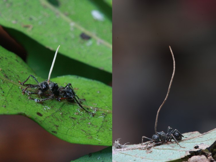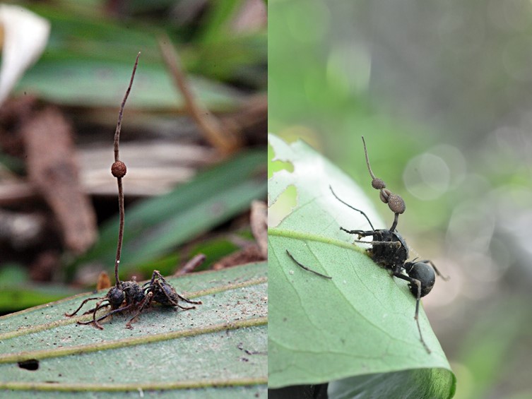 Stromata arising from the back of the head, slender, up to 12 mm long, dark brown at the base becoming light brown at the tip of the stroma. Fertile lateral cushion containing