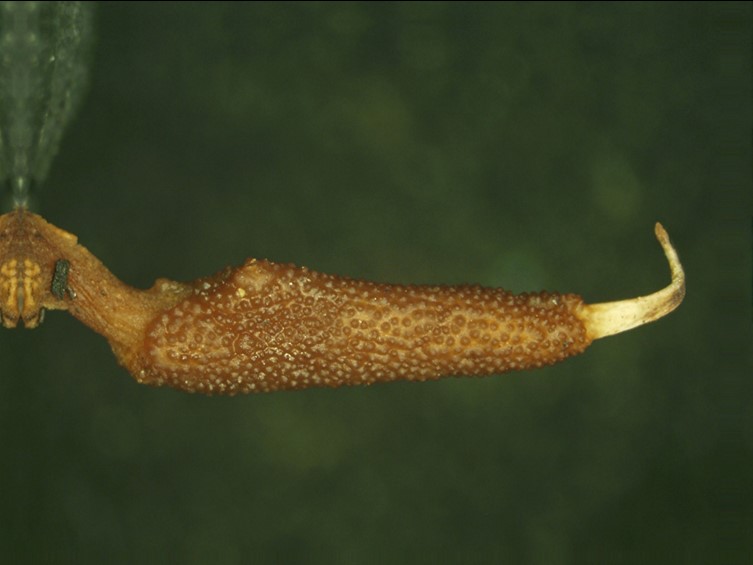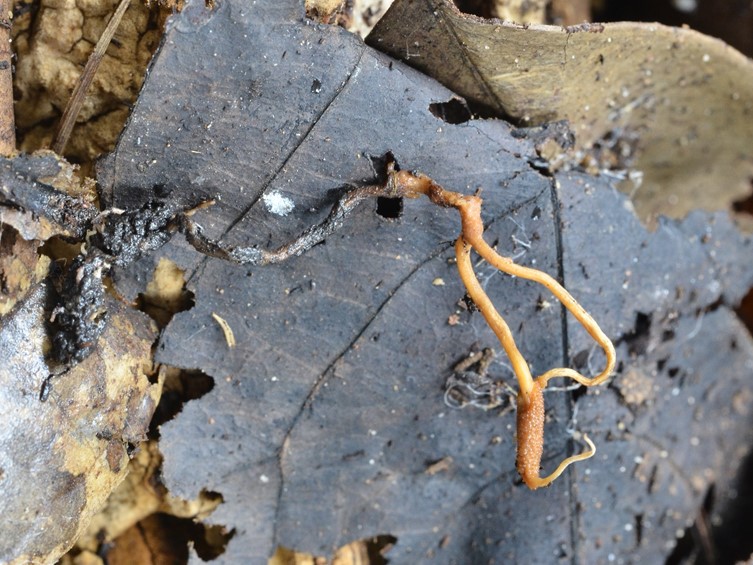 Stromata solitary or in pairs, cylindrical, gradually tapering toward the apex, strong orange yellow to moderate yellow, up to 25 mm long. Stipes cylindrical, smooth, light orange yellow, 0.5–1 mm wide. Rhizoids flexuous, 1–2 cm long buried under the ground, arising from head of Elateridae larvae (Coleoptera).