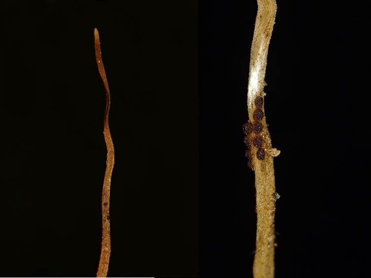 Stroma up to two, up to 45 mm long and 0.5 mm wide, cylindrical, cream to pale brown, emerging from the terminal end of the abdomen and between the thorax and abdomen of a fulgorid (Fulgoridae, Hemiptera). Perithecia superficial, ovoid, dark brown. Terminal part of the stroma bearing discontinuous layer of Hirsutella