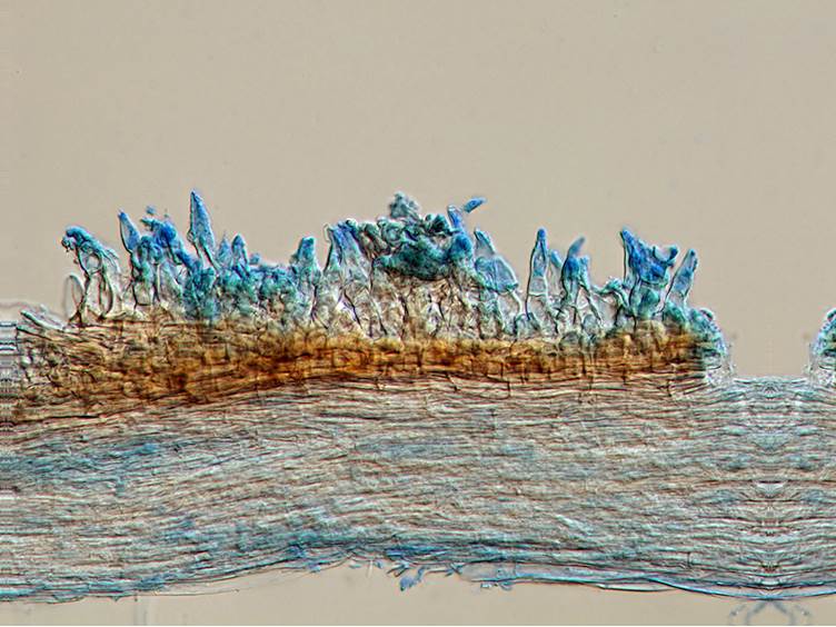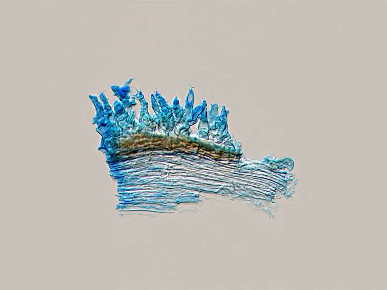 conidia which are perpendicular to the surface of the stroma. Phialides 9-33 μm, phialide base 5-22 × 4-6 μm, phialide neck 4-11 × 0.5 μm. Conidia hyaline, fusiform to ellipsoidal, herbarium material does not have a mucous sheath due to drying, 5-7 × 1.5-3 μm.