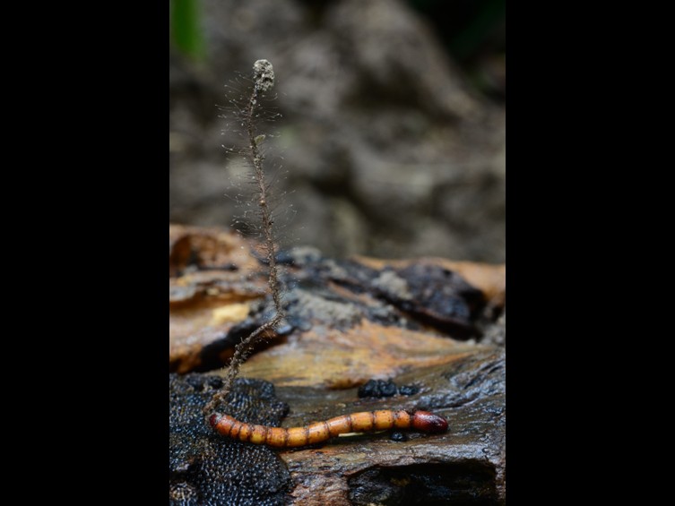 Primary synnema 9–18 cm high 1–2 mm diam, arising from the head region of the larva, branching into 2–5, cylindrical, brown to deep brown, with small white fertile head on the top, not smooth Fertile head 500–2000 µm long, 400–1000 µm diam, globose to subglobose, capitulum, white to brown, arising from the apical end of primary synnema, mess of sporangium on the surface. Sporangium 78–121 µm diam spherical, arising from the apical end of primary synnema, white colour when immature, becoming brown to dark brown after maturity, consisting of thick-walled cells. Secondary synnemata 1092–1937 × 21–34 µm, laterally from the primary synnema, brown to white, cylindrical, not smooth. Hyphae 1.8–2.8 µm wide, irregularly multi-septate, brown, cylindrical, smooth or rough, sometimes particularly expand. Phialides 25–40 × 1.3–2.5 µm, hirsutella-like, hyaline, solitary, unbranched, narrow slender, smooth. Conidia 6.7–9.8 × 2.5–3.8 µm, 1 cell, hyaline, subglobose to reniform, bound in mucilaginous spheres. Mucilaginous spheres 10.5–12.9 × 6.4–8.7 µm, composed of 1–12 conidia, hyaline, at phialide apex.