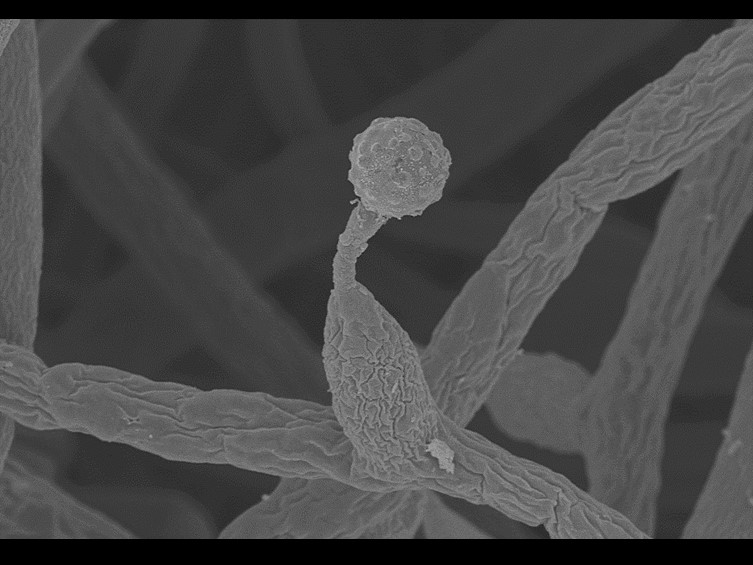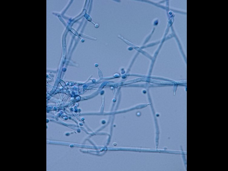 Conidia hyaline, globose, one-celled with warty surface, 2.5–3.5 μm.