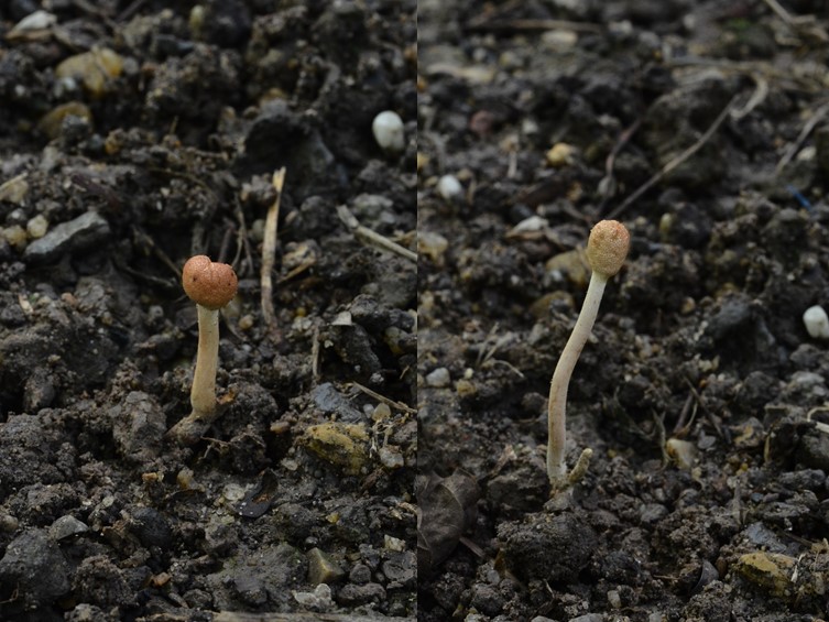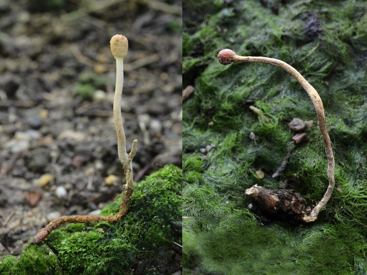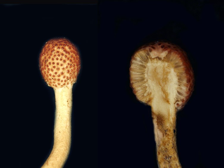 Fertile head globose, 2-4 × 3 mm, gray orange when fresh, light brown. Stipe light cream, 1-4.5 cm long, 1.5-2 mm in breadth.