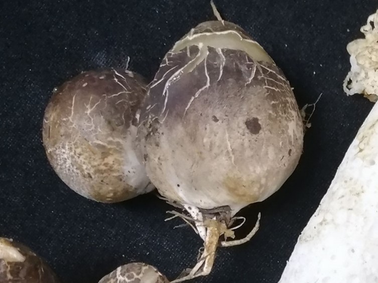 Egg globose to subglobose, 40-50 mm in diam, dark grayish yellowish brown to light gray with a white mycelial rhizomorph arising from the base. Exoperidium papery, light brownish gray, mesoperidium gelatinous or lightly viscous, transparent to subtransparent, 3-5 mm thick, dark grayish yellow; endoperidium membranous, thin, white, covering the upper surface of gleba.