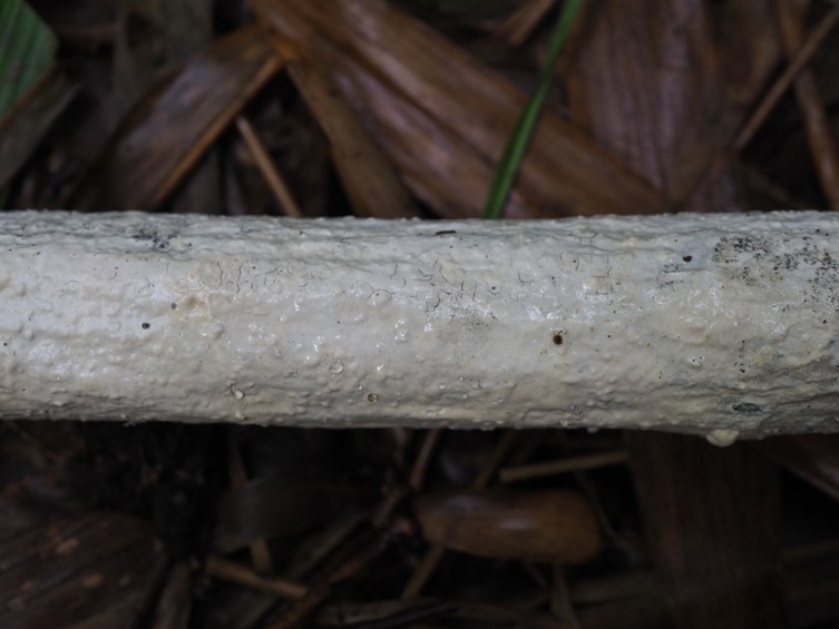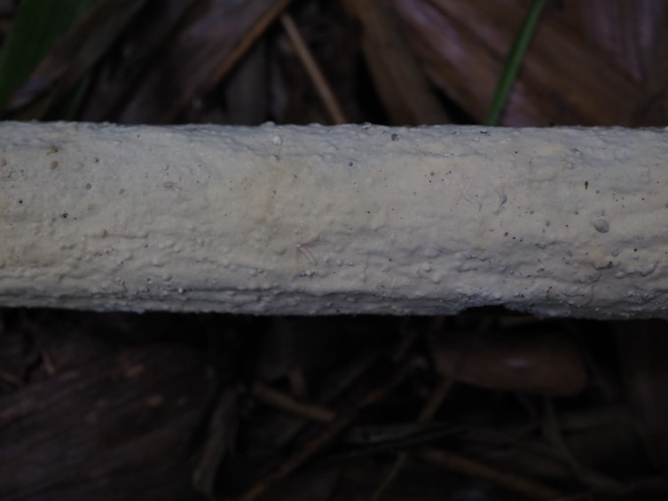 Basidiocarp broadly effused, membranaceous, moist when fresh; fertile surface yellowish-white to light brown, up to 0.25 mm thick, loosely adnate and readily separable in small patches; surface smooth, continuous, not fissured. Subiculum byssoid, white. Margin abrupt or extending up to 2 mm, pruinose to farinaceous, very thin, irregular in outline, white. Hyphal system monomitic. Subiculum composed of a textura intricata; hyphae 4.5–6 µm diam., hyaline, thin-walled or with walls up to 1 µm thick, simple-septate, branching mostly at right angles; walls smooth near the substrate but often heavily encrusted with large hyaline crystals approaching the subhymenium.