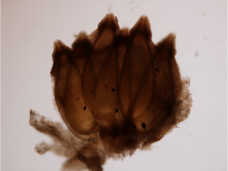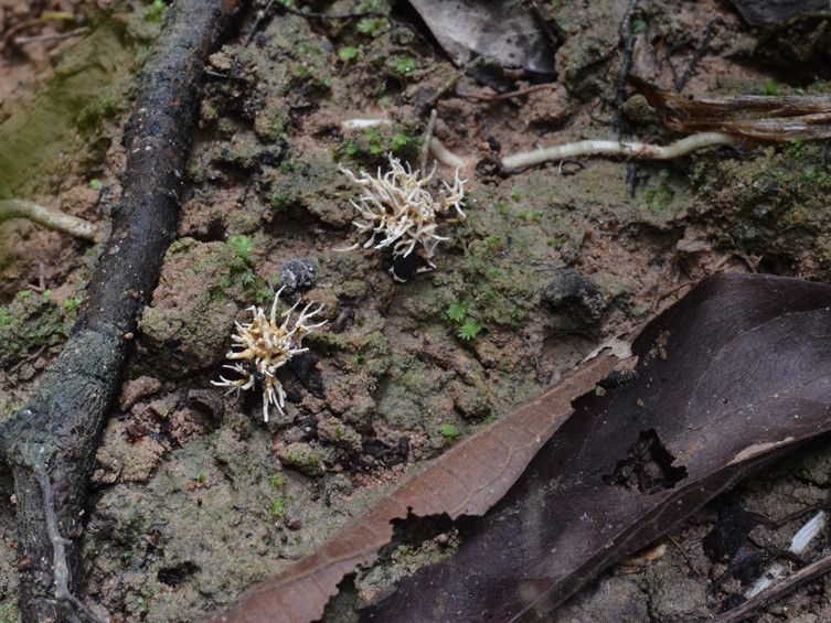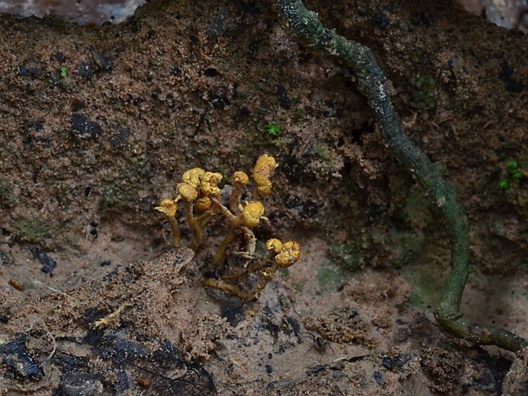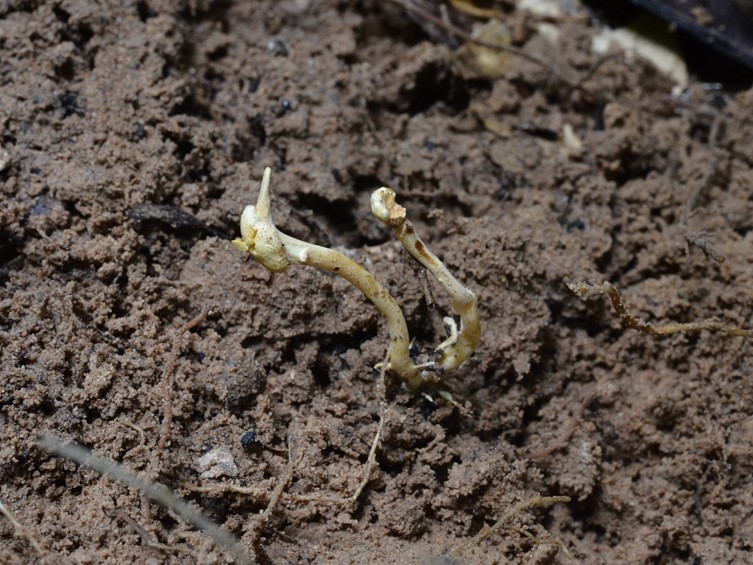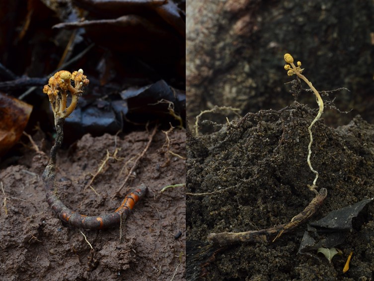 Stroma numerous, 0.5-2.5 mm in length, 1-1.5 mm in breadth, cylindrical, reddish brown. Rhizoids flexuous, arising from the head of Coleoptera larva, ca 1-3.5 cm long under the ground. Fertile part hemispherical perithecial plates, some terminal, many subterminal, pale yellowish brown, 0.5-4 mm diam, 1-2 mm high.