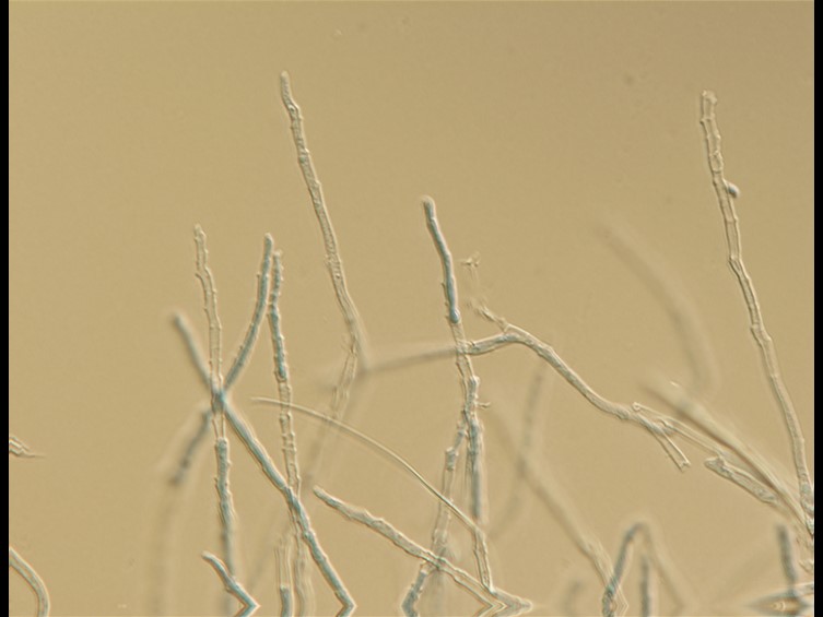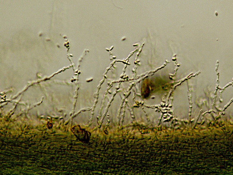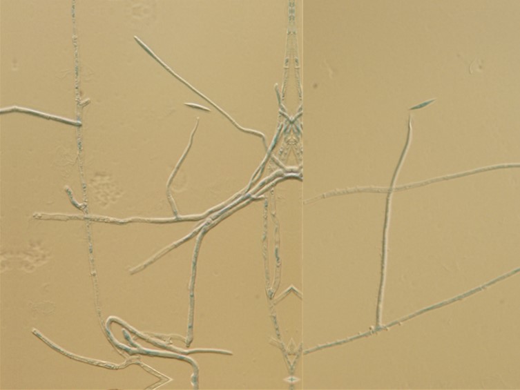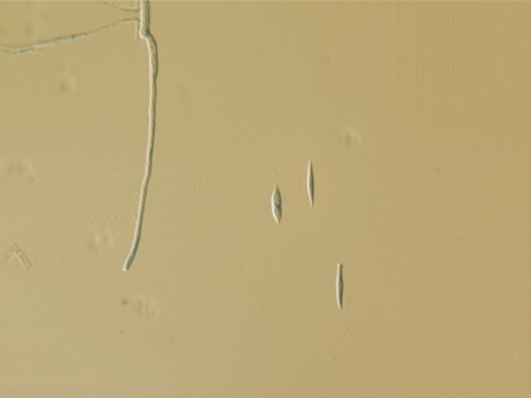 conidia: Type I (microconidia), produced on specimen, forming singly on denticles, ovoid to ellipsoidal with an apiculus, occasionally cylindrical with rounded ends, aseptate, hyaline, smooth-walled, 4–7 × 2–3 µm; Type II (macroconidia) produced on solid media (OA and PDA), fusiform, smooth-walled, 10–19 × 1.5–2 µm