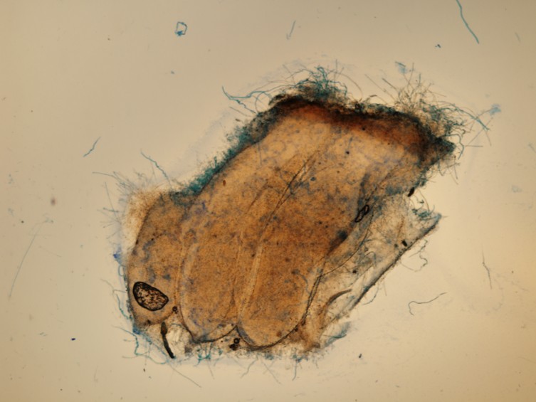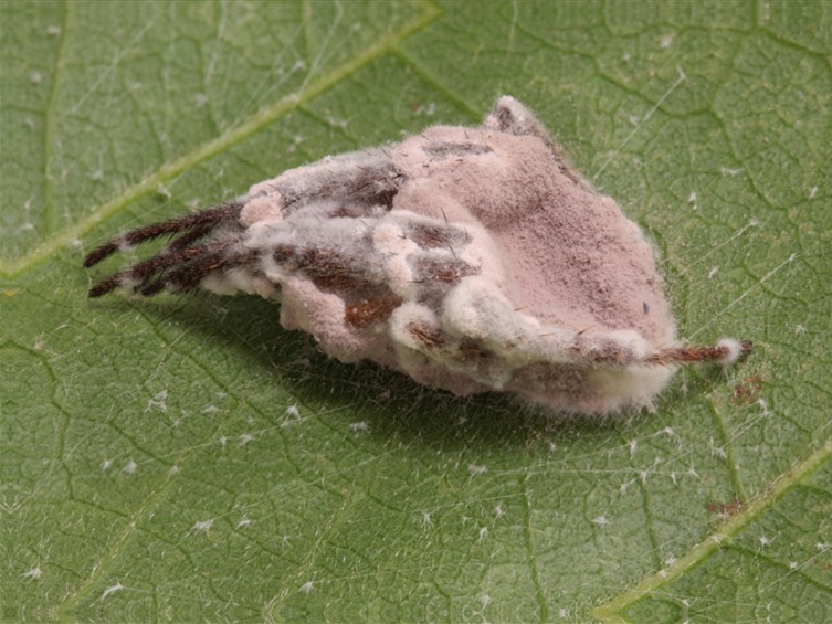 Host covered with dense weft of pink mycelia, showing a velvety appearance. In early stages the mycelia coming out of the joints in the legs and body eventually fully covered with layers of