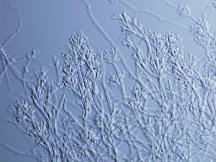 Phialides borne on the conidiophore or on small side branches, 5–7 × 2–3 μm.
