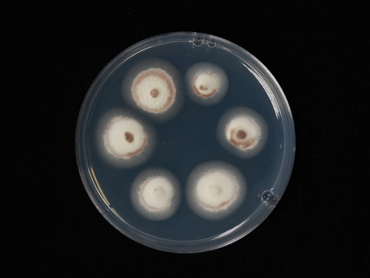 PDA attaining a diam of 10 mm in 14 d. Colonies are floccose, white, changing to grayish-purple when conidial production starts.