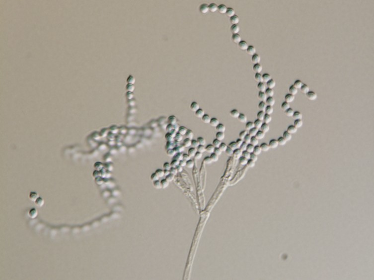 Conidia subglobose with apiculate base or limoniform, 2–3.5 × 2–3 mm, dry, in long chain.