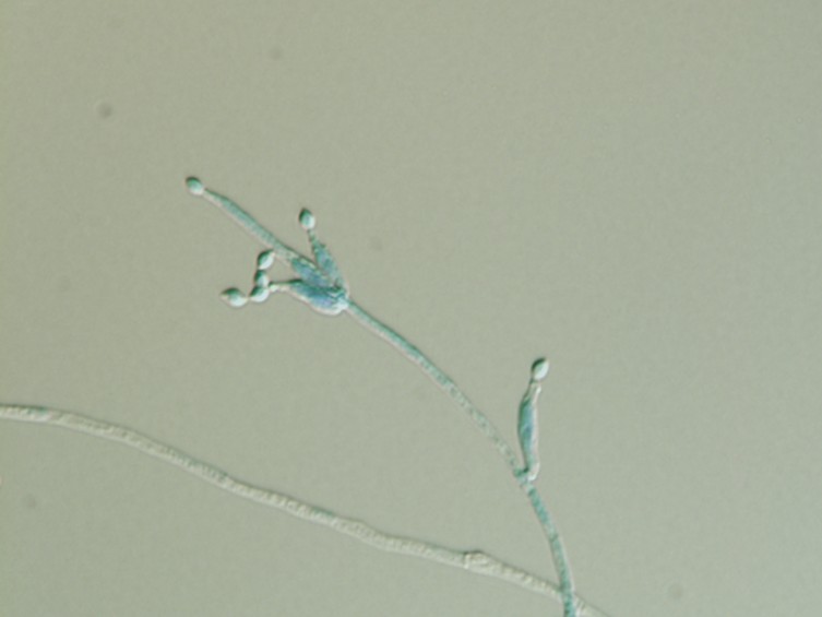 conidiophores resulting in a powdery texture, colony reverse producing a light yellow diffuse pigment. Vegetative hyphae smoo. Conidiophores forming verticillate branches with terminal whorls of three to six