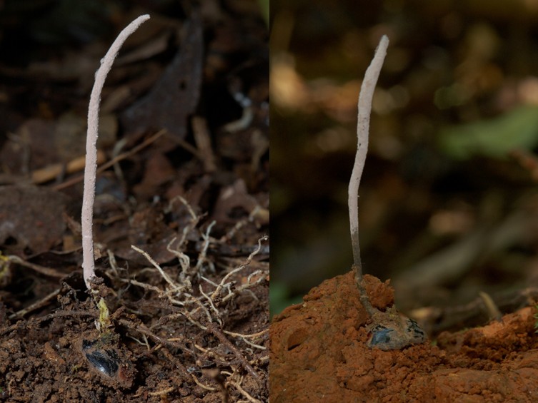 Synnema arising from head region of host, yellowish to brownish, 15–60 mm long, 0.5–2 mm wide. Synnema pink to purple due to the production of conidia.
