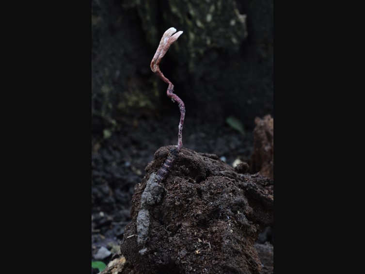 Stroma arising from the head of Lepidoptera pupa, cylindrical, solitary, simple, 18 mm long, 3 mm wide, purple. Upper part of the stroma fertile, fleshy, expanded, parted, 11 mm long, 3 mm wide, white to purple.