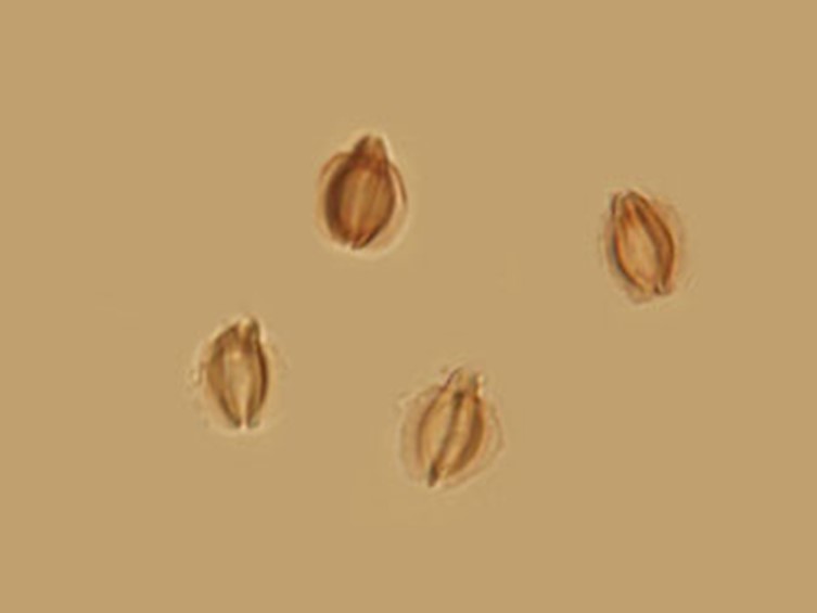 Basidiospores 12–15 × 10–13, ellipsoid to broadly ellip¬soid with longitudinal ridges, stellate in polar-view, thick-walled, yellowish to orangey hyaline to reddish yellow at first, reddish to brownish yellow with age in water, slightly reddish to brownish in 5% KOH. Basidia4–spored, 24–35 × 8–10 μm, clavate to cylindrical, hyaline in 5% KOH. Cystidia none observed. Hymenophoral trama 54–128 μm thick, irregular, with a narrow, central layer of subparallel to loosely interwoven, 3–7 μm wide, thin-walled hyphae, slightly gelatinised, hyaline in 5% KOH. Clamp connections absent.