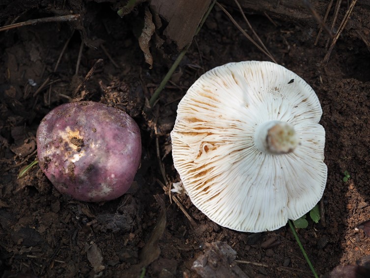 Pileus medium-sized, 3.2-5.5 cm diam, pulvinate when young,plano-convex when mature, centre depressed with age; margin even, sometimes cracking; surface smooth, viscid when moist,greyish reddish purple when young, greyish purplish red when mature, unchanging when bruised. Lamellae free close, narrow, average, crowded, often forking, with scattered lamellulae, equal, white. Stipe 1.0-1.2 × 2.5-3.0 cm, central, equal sometimes tapering,longitudinally, smooth, dry, striate, solid, rigid, chalky, white, unchanging when bruised. Context 1.0-3.0 mm thick, firm, white, unchanging when cut or bruised. Odour indistinct. Taste unrecorded. Spore print not obtained.