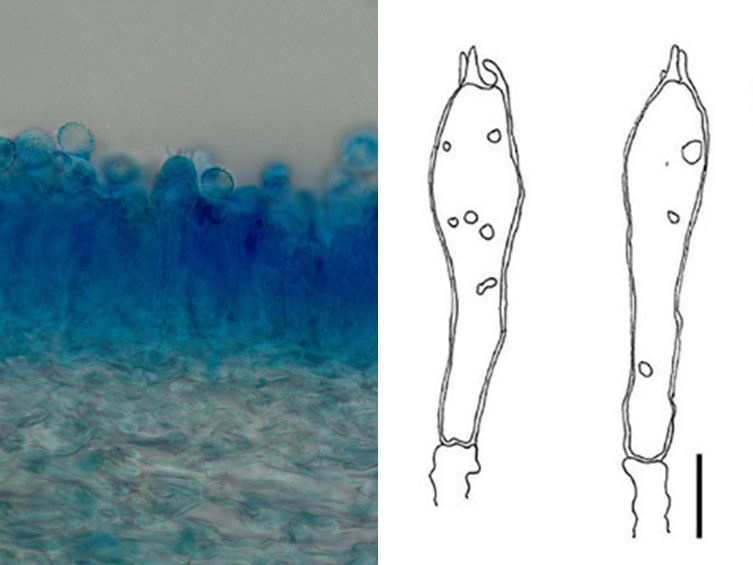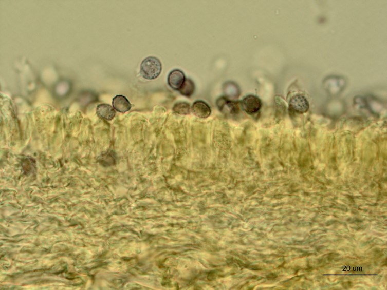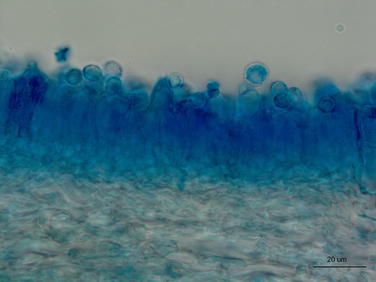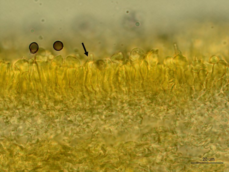 Hymenial cystidia numerous, ca 2133/mm2, 24.0-43.0 × 2.5-8.0 μm abundant, clavate to subfusiform, thin-walled, apex round and some mucronate, contents completely heteromorphous (granular or crystalline), reacting weakly greyish in sulfovanillin, abundant near the lamellae edges, 47.5-65.0 × 7.5-8.8 μm, similar to those on the sides. Lamellae edges fertile, marginal cells 12.5-23.8 × 3.8-7.5 μm, usually broadly clavate and shorter than basidia. Pileipellis metachromatic in Cresyl Blue, not sharply delimited from underlying context, 100-120 μm, deep, not gelatinised, a trichodermium, composed of hyphae 2.0-6.0 μm wide, thinwalled, septate. Acid-resistant incrustations absent. Hyphal terminations near the pileus margin occasionally branched, flexuous, thin-walled, septate, terminal cells 12.5-27.5 × 2.5-5.0 μm, conical, subulate, lageniform or cylindrical, thinwalled, branched. Terminal cells of hyphae near the pileus centre cylindrical, 12.5-20.0 × 2.5-5.0 μm. Pileus trama interwoven with sphaerocysts.