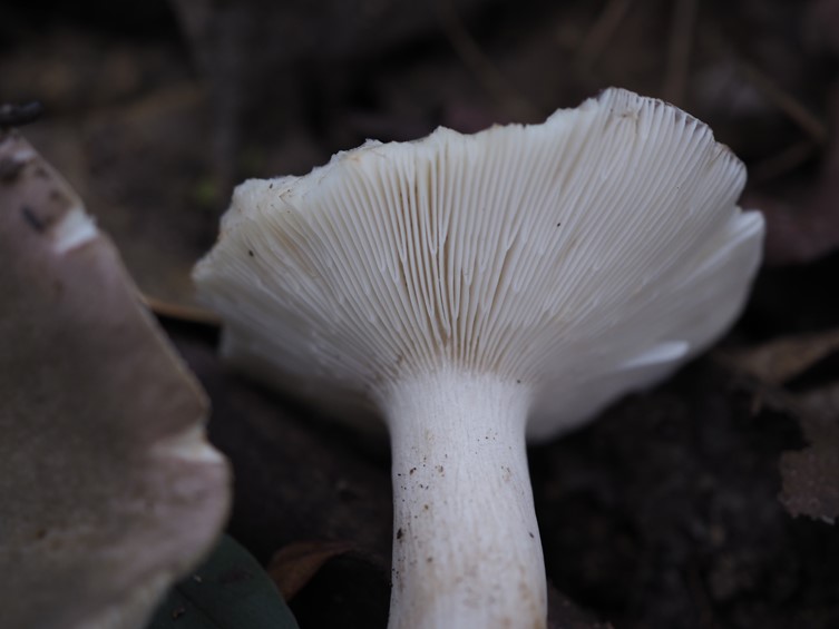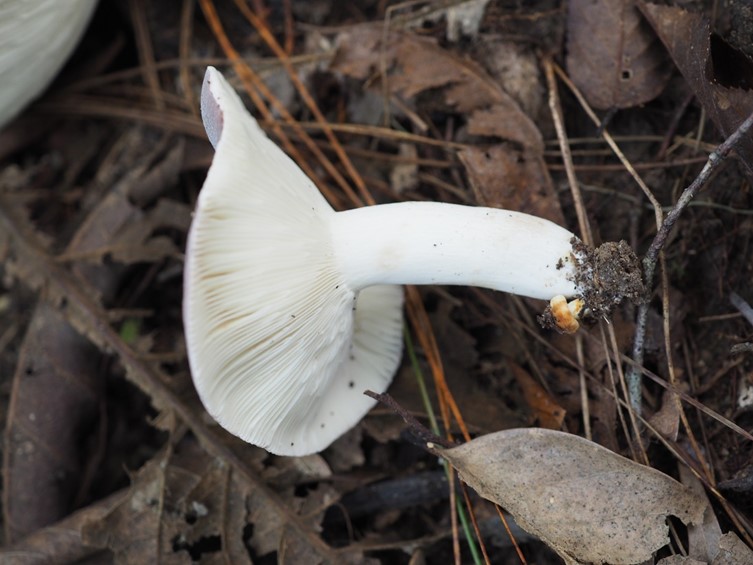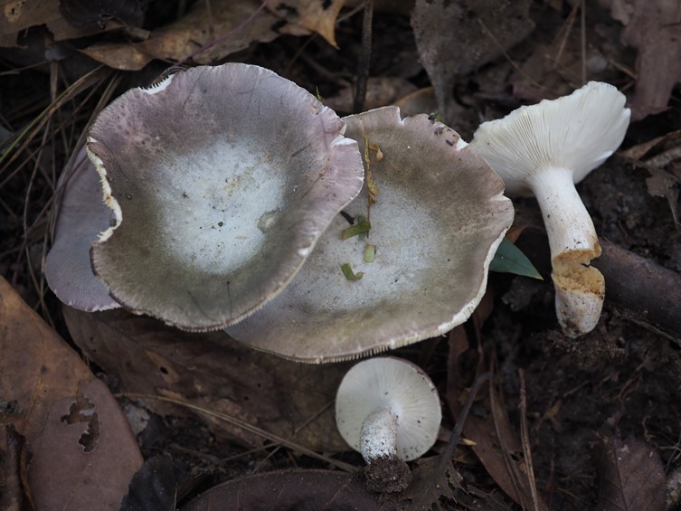 Pileus medium to large-sized, 0.4-8.0 cm diam, hemispheric when young, becoming plano-convex to applanate when mature, often slightly depressed at centre or to funnel-shaped (infundibuliform), surface smooth, viscid when moist, light brownish grey when young, greyish lilac when mature with yellowish white at the centre of pileus, unchanging when bruised, turning light yellow with 3% KOH. Lamellae decurrent, narrow, crowded, even, equal, pale purplish pink when bruised. Stipe 0.7-1.3 × 2.0-4.8 cm, central, equal, longitudinally, smooth, dry, striate, firm, solid, unchanging when bruised, turning light yellow to yellow with 3% KOH, white. Context 1-4 mm, thick, white, spongy to firm changing when cut pale purplish pink. Odour indistinct. Taste unrecorded. Spore print not obtained.