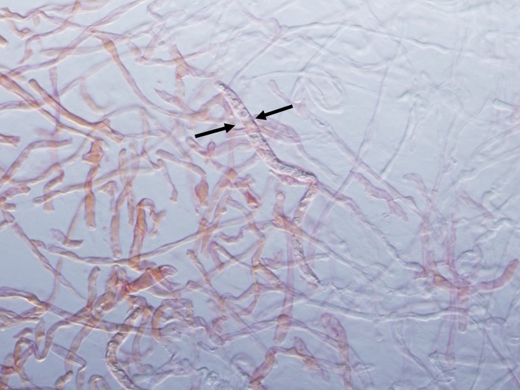 Pileocystidia near the pileus margin relatively numerous, 1-celled, cylindrical, rarely lanceolate, often very long and originating in the context, thin-walled, 62.5-137.5 × 3.8-7.5 μm, with dispersed granulations or locally heteromorphous- banded, weakly greyish in sulfovanillin. Pileocystidia near the pileus centre similar and shorter. Stipitipellis a cutis, composed of hyphae 2.0-5.0 μm wide, thin-walled, septate. Caulocystidia 35.5-45.8 × 8.5-10.3 μm, cylindrical to digitate, abundant. Clamp connections absent.