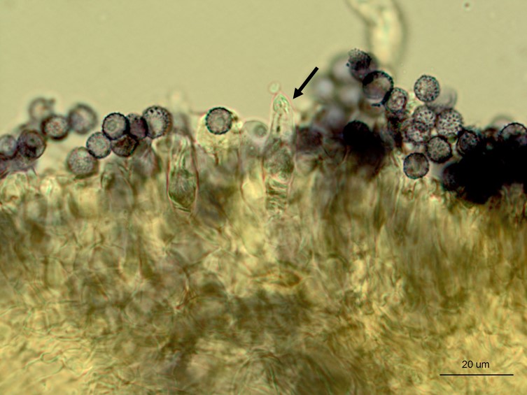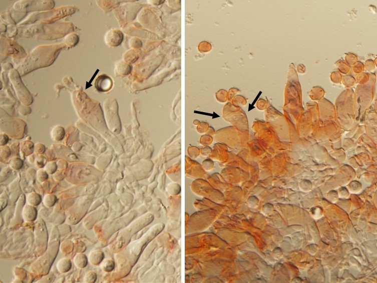 Basidia 22.0-35.3 × 5.6-9.4 μm, 4-spored with some 2-spored basidia present, narrowly clavate to clavate; sterigmata 4.0-6.0 μm in length. Lamellar trama mainly composed of nested sphaerocysts, 8.0-35.0 μm diam, and filamentous hyphae 3.0-5.0 μm thick, hyaline.