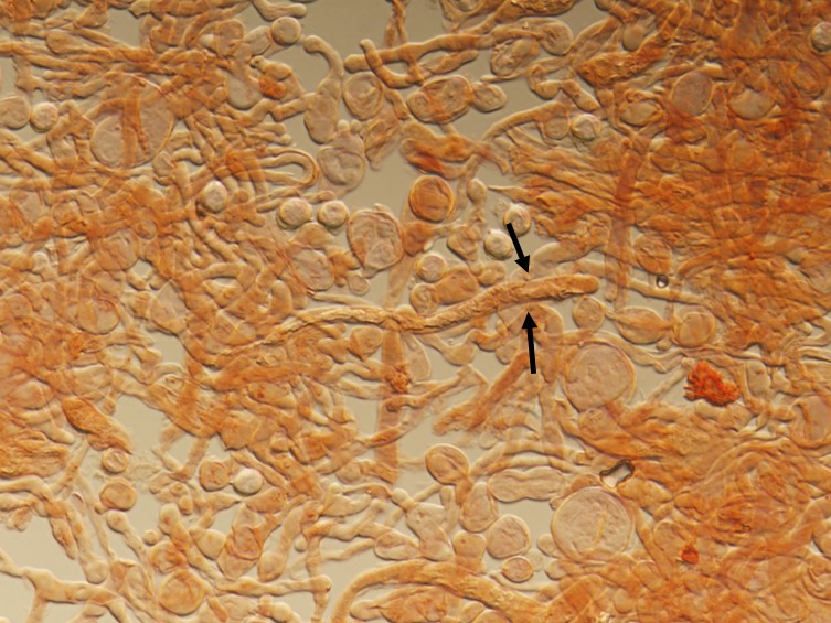 Pileocystidia near the pileus margin mainly 1-celled, clavate-pedicelate, often with strongly constricted and attenuated basal part, thin-walled, 52.5-87.5 × 5.0-8.3 μm, non-reaction in sulfovanillin. Pileocystidia near the pileus centre similar. Stipitipellis a cutis, composed of hyphae 2-4.5 μm in width, thin-walled, septate. Caulocystidia 38.5-42.5 × 5-6.5 μm, cylindrical, not abundant. Clamp connections absent.