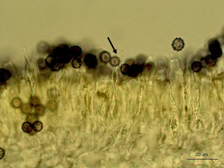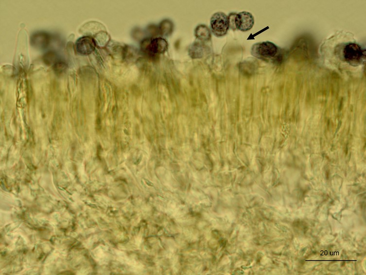 Basidia 30.9-43.8 × 5.0-9.0 μm, 4-spored with some 2-spored basidia present, narrowly clavate to clavate, sterigmata 3.0-6.0 μm in length. Lamellar trama mainly composed of nested sphaerocysts, 15.0-25.0 μm diam, and filamentous hyphae 3.0-6.5 μm thick, hyaline.