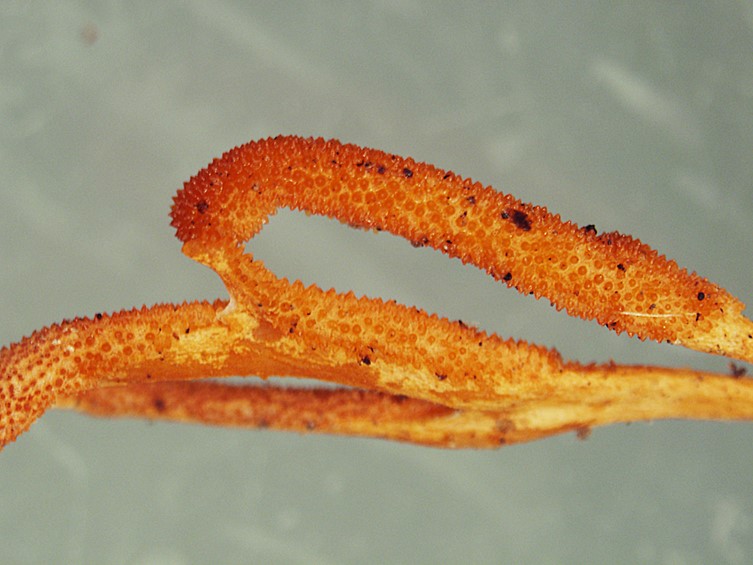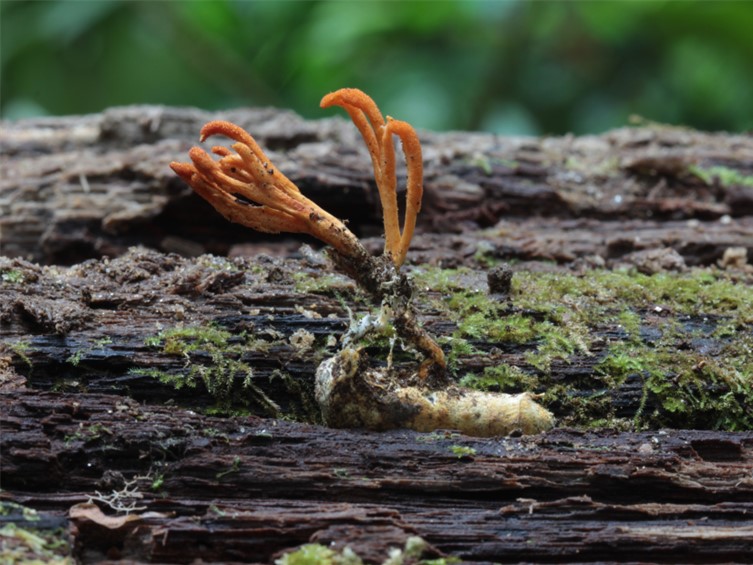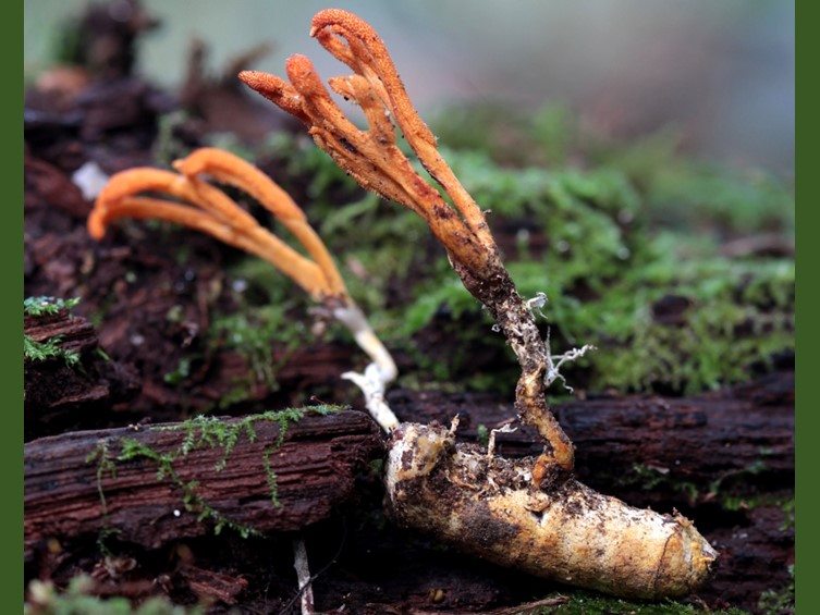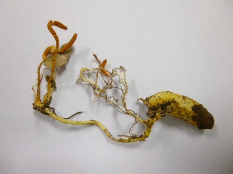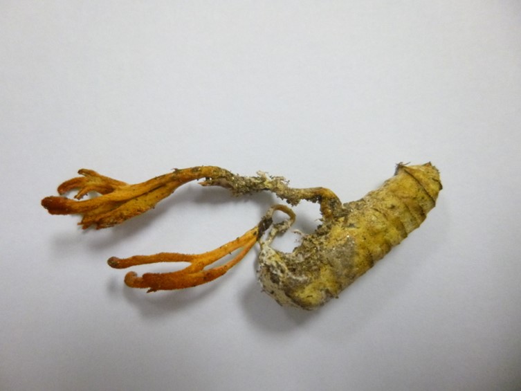 Stromata gregarious, up to 20-50 mm long and 1-1.5 mm broad, cylindrical to clavate. Rhizoids flexuous, arising from the insect host (body size 23-25 × 7-8 mm), ca 2-4 cm long under the ground. Upper part of the stromata fertile, orange red, 8-15 mm long, 1.5-2 mm broad.