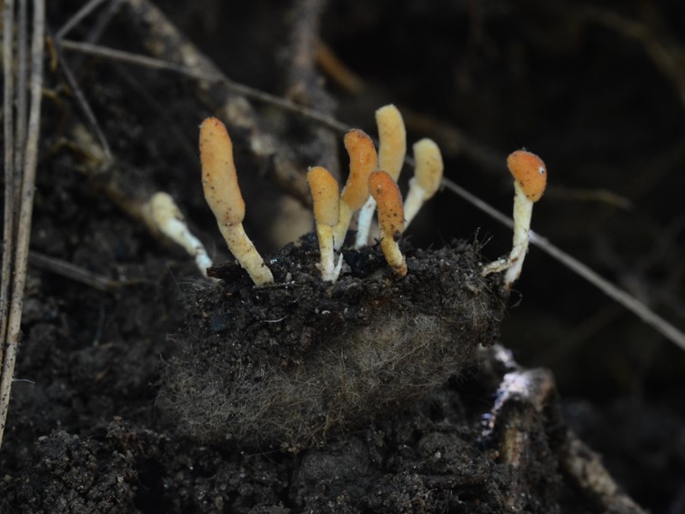 Stromata multiple, unbranched, 8–20 mm long and 0.5–2 mm broad, cream, cylindrical to enlarging apically, arising from the pupa in a cocoon (Lepidoptera). Fertile part orange yellow, 2–8 mm long, 2–3 mm broad.