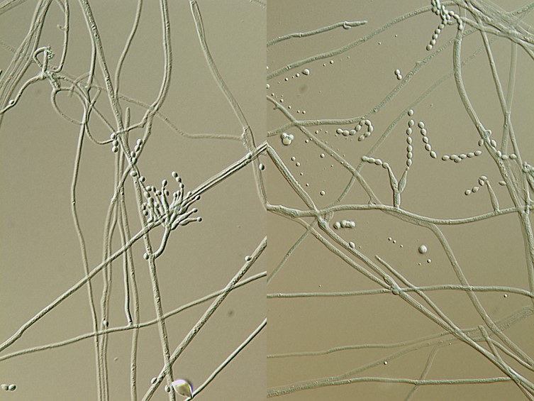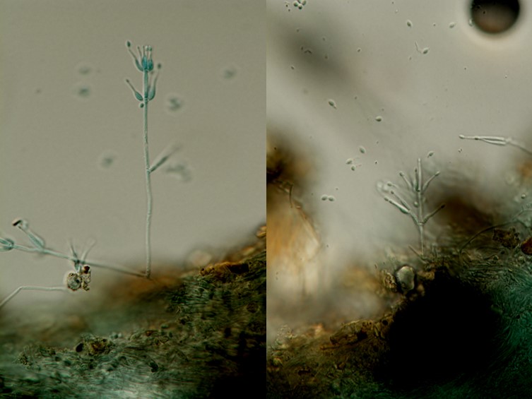 Phialides verticillate, in whorls of two to five, 5–12 × 2–3 μm, with basal portion swollen to ellipsoidal, tapering into a distinct neck, 4–6 × 1 μm. Conidia in chains, ellipsoidal, white, 1.5–3 × 1–2 μm.