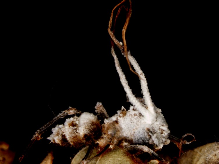 Mycophylic on Ophiocordyceps camponoti-leonardi (Ophiocordycipitaceae) attached to unidentified dicotyledonous leaves of forest plants.