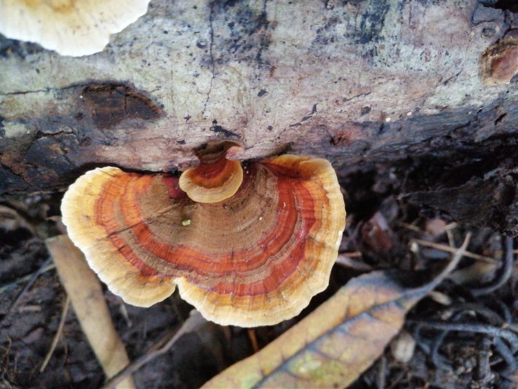 Basidiomata 10–70 mm broad, flabelliform to shell-shaped, thin, sessile. Pileus surface initially villose to finely tomentose or glabrous, soon becoming smoother with age; zonation conspicuous, concentric, with coloration variable from dark orange to moderate yellowish brow; surface sometimes overgrown with algae, imparting a greenish tint. Context very thin, coriaceous to tough, inedible, lacking any distinctive odor. Stipe absent. Hymenophore smooth (non-poroid), even, coloration white to grey or reddish-brown. Spore print white. Basidiospores 5.5–7.5 × 2–3 µm, hyaline, smooth, cylindrical to narrowly ellipsoid.