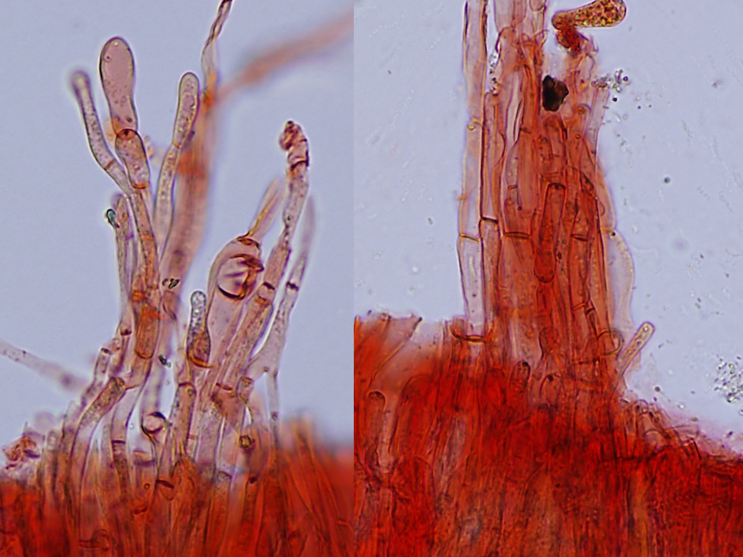 Basidiomata solitary 55–65 mm wide, shape of centre with acute papilla, moist, cap margin split, dark greyish yellowish brown of centre, moderate yellowish brown. Stipe 40–60 × 10–15 mm, cylindrical to subclavate with pseudorrhiza, firm and fibrous, solid, surface; dry and eibrous, pale yellow to yellowish white. Basidiospores ovoid to subglobose, smooth, hyaline, thin-walled, 5.0–7.5 × 3.8–5.5 µm. Basidia clavate shaped, hyaline thin-walled, 17.5–27.5 × 6.3–8.8 µm, four sterigma, 0.5–1.3 µm long. Pileipellis branched and septate, hyaline to yellow, 2.5–25.0 µm wide. Stipitipellis hyaline to pale yellow, branch, septate, 2.5–12.5 µm wide.