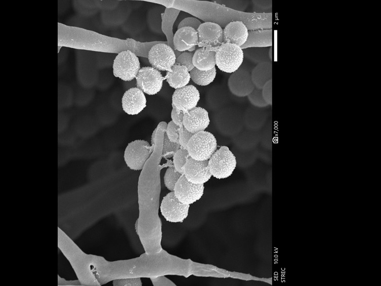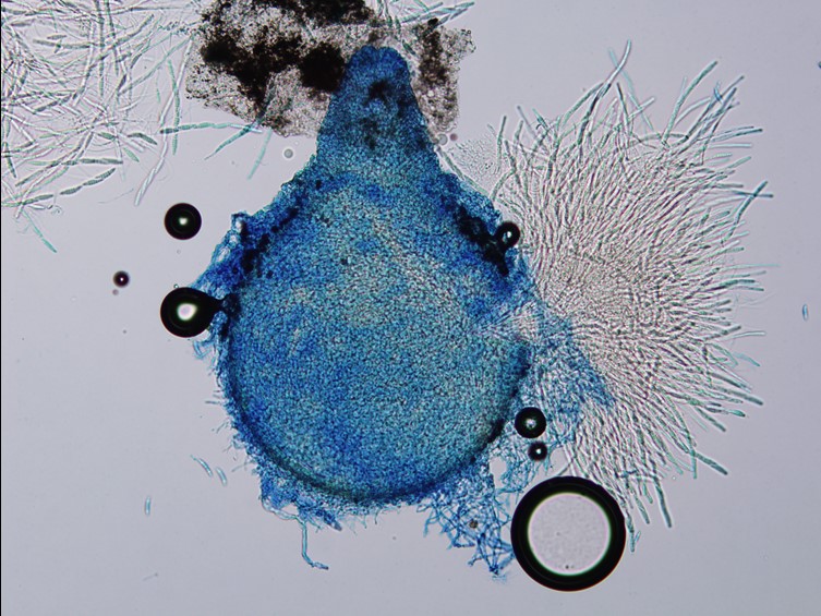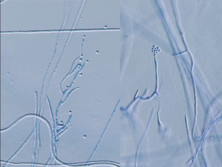 Conidia hyaline, smooth, globose, 1.5–2 μm diam, rarely ovoid, 3.5 μm long, aggregated in slimy heads.