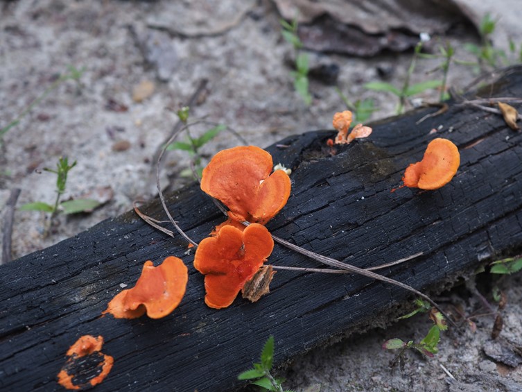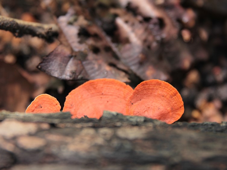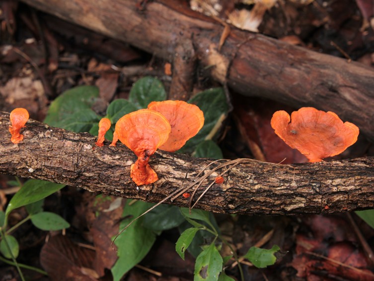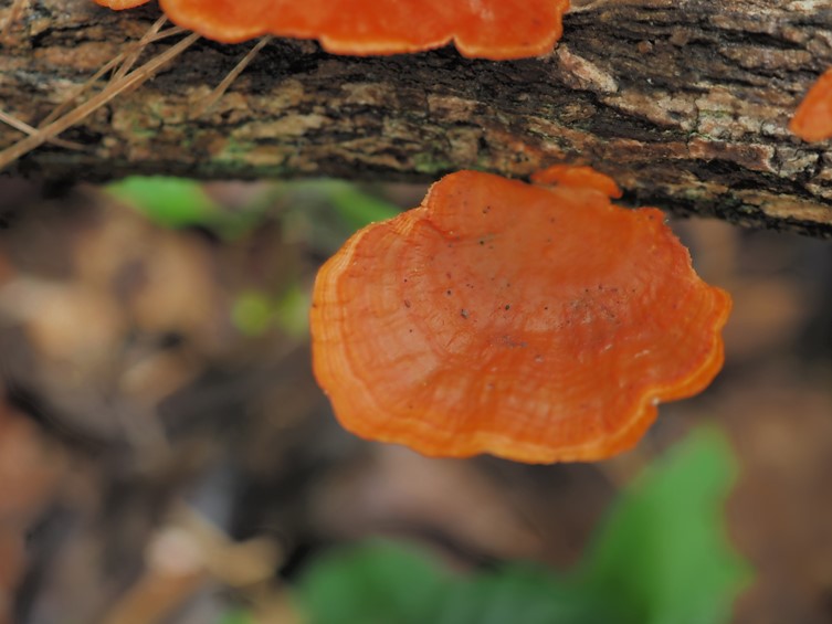 Basidiocarp smooth, flabelliforme velutinous surface to glabrous, zoned; acute margin, smooth to wavy thin, sterile, bright reddish orange, 25–30 × 22–30 × 4– 10 mm, Context 2 mm, corky consistency to floccose. Hymenophore orange-red, pores 4–6 mm, tubes 1 mm deep. Hyphal system Trimitic. Basidiospores 5–6 × 2–3 µm, cylindrical, smooth, thin-walled.